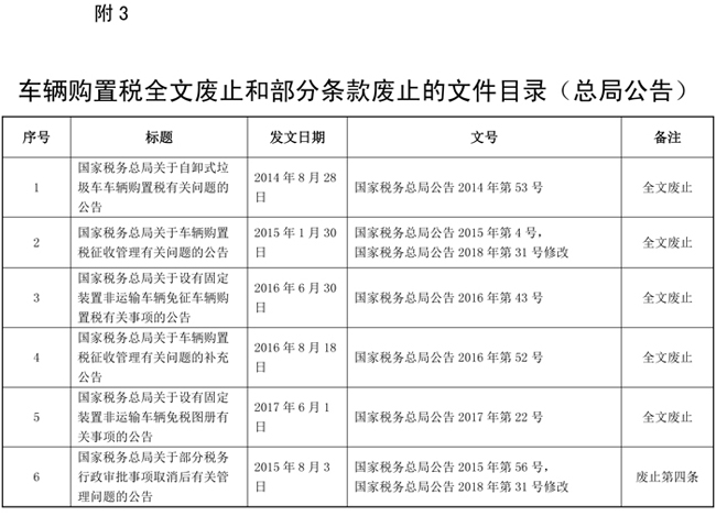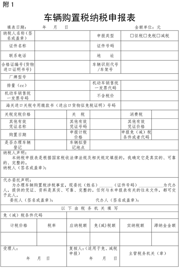為落實《中華人民共和國車輛購置稅法》(以下簡稱《車購稅法》),規范車輛購置稅征收管理,現就有關事項公告如下: 一、車輛購置稅實行一車一申報制度。 二、《車購稅法》第六條第四項所稱的購置應稅車輛時相關憑證,是指原車輛所有人購置或者以其他方式取得應稅車輛時載明價格的憑證。無法提供相關憑證的,參照同類應稅車輛市場平均交易價格確定其計稅價格。無同類應稅車輛市場平均交易價格的,由稅務機關依據《中華人民共和國稅收征收管理法》(以下簡稱《稅收征管法》)及其實施細則核定其應納稅額。 原車輛所有人為車輛生產或者銷售企業,未開具機動車銷售統一發票的,按照車輛生產或者銷售同類應稅車輛的銷售價格確定應稅車輛的計稅價格。無同類應稅車輛銷售價格以及同類應稅車輛無銷售價格的,按照組成計稅價格確定應稅車輛的計稅價格。 三、購置應稅車輛的納稅人,應當到下列地點申報納稅: 。ㄒ唬┬枰k理車輛登記的,向車輛登記地的主管稅務機關申報納稅; 。ǘ┎恍枰k理車輛登記的,單位納稅人向其機構所在地主管稅務機關申報納稅,個人納稅人向其戶籍所在地或者經常居住地的主管稅務機關申報納稅。 四、《車購稅法》第十二條所稱納稅義務發生時間,按照下列情形確定: (一)購買自用應稅車輛的為購買之日,即車輛相關價格憑證的開具日期; 。ǘ┻M口自用應稅車輛的為進口之日,即《海關進口增值稅專用繳款書》或者其他有效憑證的開具日期; 。ㄈ┳援a、受贈、獲獎或者以其他方式取得并自用應稅車輛的為取得之日,即合同、法律文書或者其他有效憑證的生效或者開具日期。 五、納稅人辦理納稅申報時應當如實填報《車輛購置稅納稅申報表》(附件一,以下簡稱《納稅申報表》),同時提供車輛合格證明和車輛相關價格憑證。 六、納稅人在辦理車輛購置稅免稅、減稅時,除按本公告第五條規定提供資料外,還應當根據不同的免減稅項目,分別提供以下資料的原件或者復印件: 。ㄒ唬┩鈬v華使館、領事館和國際組織駐華機構及其有關人員自用車輛,提供機構證明和外交部門出具的身份證明。 (二)城市公交企業購置的公共汽電車輛,提供所在地縣級以上(含縣級)交通運輸主管部門出具的公共汽電車輛認定表。 (三)懸掛應急救援專用號牌的國家綜合性消防救援車輛,提供中華人民共和國應急管理部批準的相關文件。 (四)回國服務的在外留學人員購買的自用國產小汽車,提供海關核發的《中華人民共和國海關回國人員購買國產汽車準購單》。 (五)長期來華定居專家進口自用小汽車,提供國家外國專家局或者其授權單位核發的專家證或者A類和B類《外國人工作許可證》。 七、免稅、減稅車輛因轉讓、改變用途等原因不再屬于免稅、減稅范圍的,納稅人在辦理納稅申報時,應當如實填報《納稅申報表》。發生二手車交易行為的,提供二手車銷售統一發票;屬于其他情形的,按照相關規定提供申報材料。 八、已經繳納車輛購置稅的,納稅人向原征收機關申請退稅時,應當如實填報《車輛購置稅退稅申請表》(附件二,以下簡稱《退稅申請表》),除提供納稅人身份證明外,還應當按照下列情況分別提供以下資料: (一)車輛退回生產企業或者銷售企業的,提供生產企業或者銷售企業開具的退車證明和退車發票。 (二)其他依據法律法規規定應當退稅的,根據具體情形提供相關資料。 九、納稅人應如實申報應稅車輛的計稅價格。 納稅人沒有編造虛假計稅依據的,稅務機關按照其申報的計稅價格征收稅款;納稅人編造虛假計稅依據的,稅務機關依照《稅收征管法》及其實施細則的相關規定處理。 十、稅務機關追繳稅款時,納稅人無法按照規定提供申報資料的,可以依據司法、審計、財政等有關機關的文書,為其辦理補稅手續。 十一、本公告要求納稅人提供的資料,稅務機關能夠通過政府信息共享等手段獲取相關資料信息的,納稅人不再提交。 十二、本公告所稱的納稅人身份證明:單位納稅人為《統一社會信用代碼證書》或者營業執照或者其他有效機構證明,個人納稅人為居民身份證或者居民戶口簿或者入境的身份證件。 本公告所稱車輛合格證明為整車出廠合格證或者車輛電子信息單。 本公告所稱車輛相關價格憑證,境內購置車輛為機動車銷售統一發票或者其他有效憑證,進口自用車輛為《海關進口關稅專用繳款書》或者海關進出口貨物征免稅證明。屬于應征消費稅車輛的還包括《海關進口消費稅專用繳款書》。 十三、稅務機關應當在稅款足額入庫或者辦理免稅手續后,將應稅車輛完稅或者免稅電子信息,及時傳送給公安機關交通管理部門。 上款所指稅款足額入庫的情形包括:納稅人到銀行辦理車輛購置稅稅款繳納(轉賬或者現金)由銀行將稅款繳入國庫的,國庫已傳回《稅收繳款書(銀行經收專用)》聯次;納稅人通過橫向聯網電子繳稅系統等電子方式繳納稅款的,稅款劃繳已成功;納稅人在辦稅服務廳以現金方式繳納稅款的,主管稅務機關已收取稅款。 十四、納稅人名稱、車輛廠牌型號、發動機號、車輛識別號、證件號碼等應稅車輛完稅或者免稅電子信息與原申報資料不一致的,納稅人可以到稅務機關辦理完稅或者免稅電子信息更正,但是不包括以下情形: 。ㄒ唬┸囕v識別代號(車架號)和發動機號同時與原申報資料不一致。 。ǘ┩甓