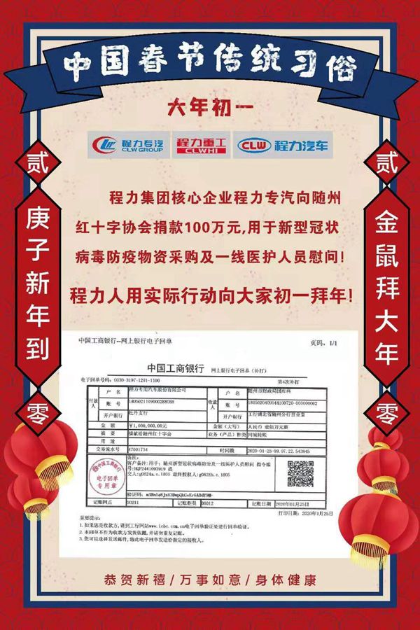 | 湖北程力集團向隨州市紅十字會捐贈人民幣100萬元,用于抗擊新冠肺炎疫情。此外,該公司正在抓緊調(diào)配設(shè)備,趕制負(fù)壓救護車,助力早日打贏這場沒有硝煙的戰(zhàn)爭。 “各位程力家人,今年除夕我就不給大家發(fā)紅包了,我代表大家向隨州紅十字會捐獻(xiàn)100萬元。”大年初一,程力汽車集團董事長程阿羅的一則微信刷爆隨州人的朋友圈,他說,這是所有程力人的心意,將專項用于隨州新型冠狀病毒感染肺炎防治物資保障和醫(yī)護人員慰問。 目前,運送新冠肺炎患者的負(fù)壓救護車緊缺。程力集團是全國12家具有該車生產(chǎn)資質(zhì)的企業(yè)之一,也是湖北唯一一家。該公司正在緊急調(diào)配負(fù)壓設(shè)備,并同時召回員工100余人,加班加點生產(chǎn)趕制。預(yù)計2月3日和4日分別交付4臺,5日開始每天可交付7臺。 程阿羅表示,程力還將為曾都區(qū)捐獻(xiàn)一臺負(fù)壓救護車。“程力集團將堅決扛起社會責(zé)任,全力支持配合湖北省及隨州市防治工作,為疫情防治做出程力貢獻(xiàn)!”程阿羅說。 ![]() |