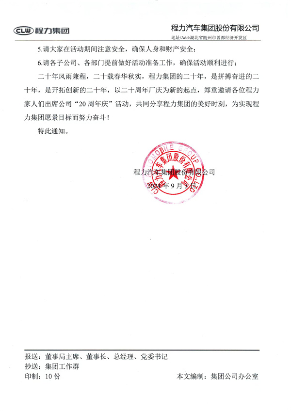 關于程力集團二十周年廠慶的通知 尊敬的程力家人們: 時光荏苒,歲月如梭。在這個秋高氣爽,充滿希望與收獲的季節里,程力集團即將迎來二十周年廠慶,為了慶祝這一具有重大意義的時刻,集團公司決定舉辦一系列豐富多彩的慶典活動,活動詳情如下: 一、活動時間 9月15日(全天),8:30-23:58。 二、活動地點 曾都經濟開發區程力集團(新廠)程力大舞臺 ![]() 三、活動內容 1.舉辦盛大的慶祝儀式,回顧程力集團二十年的發展歷程,表彰為集團發展做出突出貢獻的員工; 2.開展新LOGO、廠歌發布,展示程力集團的新品牌和企業文化; 3.邀請專家學者舉辦專用汽車專題報告和新能源、應急裝備、國際貿易分論壇,探討專用汽車行業的發展趨勢和未來前景; 4.組織員工文藝匯演,展現程力人的風采和精神風貌。 四、注意事項 1.憑票入場; 2.參會人員上午統一著20周年藍色T恤衫入場,參加晚會的,統一著20 周年紀念版白色T恤衫入場參與晚會互動; 3.參加活動的人員請遵守活動現場的秩序,聽從工作人員的安排,遵守會場的紀律; 4.參會人員不得中途退場; 5.請大家在活動期間注意安全,確保人身和財產安全; 6.請各子公司、各部門提前做好活動準備工作,確;顒禹樌M行; 二十年風雨兼程,二十載春華秋實,程力集團的二十年,是拼搏奮進的二十年,是開拓創新的二十年,以二十周年廠慶為新的起點,鄭重邀請各位程力家人們出席公司“20周年慶”活動,共同分享程力集團的美好時刻,為實現程力集團愿景目標而努力奮斗! 特此通知。 ![]() ![]() |