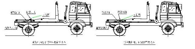 拉臂式垃圾車(車廂可卸式垃圾車)使用說明 一、概述 什么是勾臂垃圾車? 車廂可卸式垃圾車又稱拉臂式垃圾車(以下簡稱垃圾車)是用于城鎮袋裝、散裝生活垃圾物的收集、運輸、卸料作業的專用車輛。 該車是由汽車底盤、拉臂主油缸、附車架、翻轉架、支撐腿(選裝)、鎖緊架、鎖緊油缸及多路換向閥等組成。翻轉架一端連在附車架上,其另一端設有活動拉臂,中間安裝有鎖緊系統;活動臂油缸一端連在活動臂上,另一端連接在附車架上;鎖緊機構通過鎖緊油缸的動作可以在箱體自卸時將附車架上的箱體與翻轉架及拉臂連為一體,在主油缸伸出時形成自卸角,也可以通過鎖緊油缸的收回把翻轉架與附車架鎖緊為一體,利用主油缸的收回或伸出使活動拉臂將地下的垃圾箱拖拉至附車架上或從附車架上放回到地面。 該車可將地下垃圾箱內的垃圾及垃圾箱一同拉至車上運走同時可自卸,降低了工人的勞動強度。該垃圾車的收運方式是目前世界上廣泛采用的垃圾收運方式,可以實現一車多箱,大大降低了配備成本和空間等等;其專用裝置的功能均以汽車發動機為動力,通過液壓機構手動或電控來實現。車輛的箱體采用優質炭鋼板全密封焊接結構,具有強度高、重量輕、不產生二次污染等優點。 二、結構簡圖 三、操作步驟 在裝載垃圾前,空載運轉達到6個標準氣壓時,掛上取力器(駕駛室內方向盤左下方),檢查各部件有無泄漏或異常后,再按照操作指示牌指示位置進行操作;其具體操作步驟如下: 拉起垃圾箱體 步驟1.將鎖緊鉤操作手柄推至收回位置,鎖緊油缸收回,使鎖緊架收回并將翻轉架與附車架鎖緊固定;如圖: 步驟2.將拉臂操作手柄拉起到伸起位置,拉臂油缸伸出,活動拉臂繞翻轉翻轉架前鉸鏈軸旋轉,拉臂處于鉤箱位置,適當調整拉臂鉤高度并與箱體彎鉤對準;如圖: