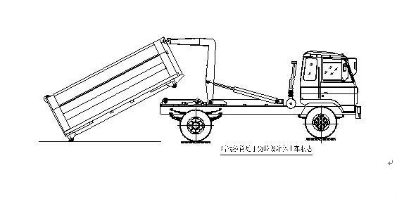 步驟3.當拉臂鉤鉤到箱體彎鉤時,繼續推下拉臂操作手柄到落下位置,使垃圾箱體繼續上車(注意:保證垃圾箱體的縱梁位于附車架尾部兩后滾輪之間);如圖: