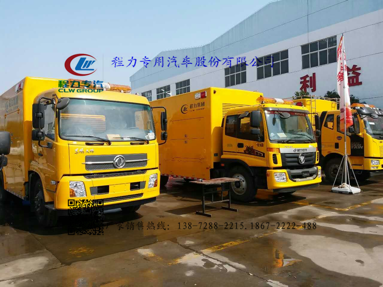 選裝配置:選裝行李架、爬梯、車頂工作臺;選裝不同形狀、結構的警示燈;選裝中隔斷(可選擇開門)、車身兩側可選開上掀門、盲窗、側開門;花紋鋁板;加裝設備工具柜、配電箱、發電機組、水泵、電焊機、空壓機等線路安裝外接電源系統、(室內燈光照明、探照燈、高桿照明燈等);繞線盤,還可根據用戶不同需求加裝不同的維修搶險設備、車身制作專用圖案或標識。 東風天錦工程救險車、抗洪救災車,搶險車,抗洪吸水車,抗旱車 程力專用汽車股份有限公司最新研發的搶險救援車,工程搶險車,抗洪吸水車,應急電源泵車,移動水泵車。該車排水量1000立方/小時,操作簡單,機動性強,真正實現了移動水泵的概念,設備可滿足緊急排水搶險的需要,并具備移動電源功能。 設備采用東風底盤改裝,總質量12.5噸,發動機功率127kw,排放標準達到國五標準,3.8米軸距,帶空調,方向助力,最大涉水深度600mm。 發電機備用功率120kw,額定輸出功率110kw,額定頻率50HZ,額電壓230/240V,康明斯發動機。電子調速,啟動電瓶,電瓶總閘。 車廂內專設接地樁頭,連接方便,在機組工作時,連接接地線,保護作業安全。機電設備有嚴密的防漏電保護措施。 控制系統采用智能控制,集中控制,中文界面,具有自動障礙保護功能,選用優質電器元件,性能穩定,安全可靠。 該車配備一臺一體式真空輔助自吸排污泵,流量1000立方/小時,電機功率55kw,揚程12米,吸程8米,安裝在車尾部,方便拆卸水管及出水,該泵無需灌水,無需額外增加水環泵輔助抽真空,性能好,出水快,水泵啟動采用軟啟動。抽水管為兩個八寸管,采用美國進口透明水管,質量輕,拿取方便,配3.5米長水管4根。接頭都采用東方式快速接頭,使用方便,密封效果好,每個進水口配置鴨嘴式接頭,實現低水位抽吸作業。各進水口配90度彎頭。 排水口分為4個5寸出水口,每個出水口66米出水軟管,(33米每卷)軟管為快速接頭連接,操作方便,并在接頭出設有防松保險裝置,安全可靠。材質為雙面PVC,耐磨,耐壓。 發電機組:發動機備用功能120KW額定輸出功率110KW,額定頻率50HZ,額電壓230/400V,康明斯發動機,調速方式:電子調速,啟動電瓶,電瓶總閘