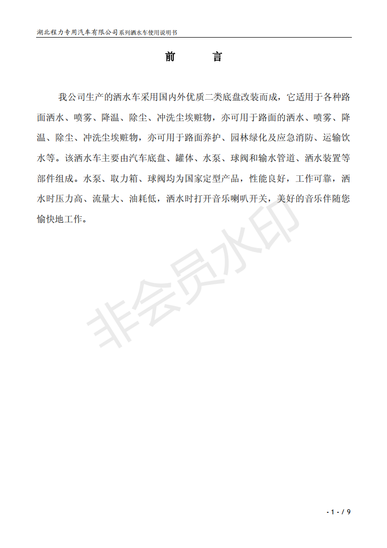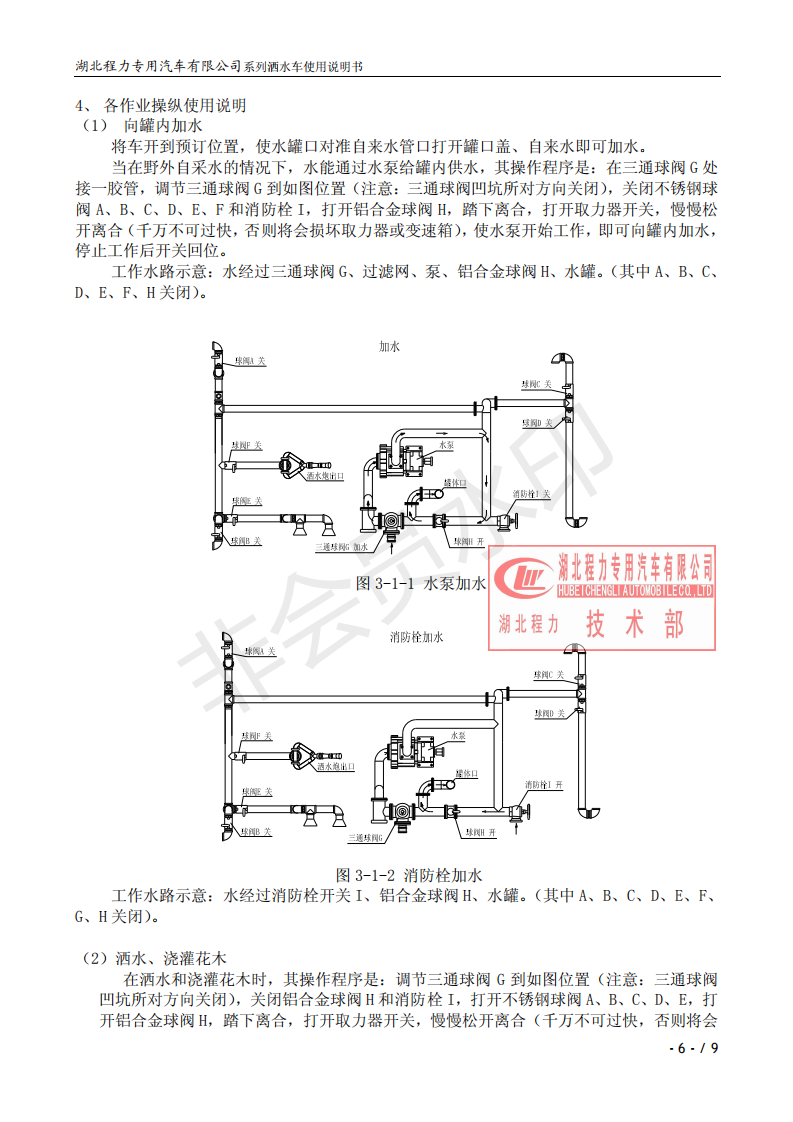 湖北程力專業生產東風小霸王灑水車、東風多利卡灑水車、東風灑水車、東風大金剛灑水車、東風140灑水車、東風140/47灑水車、東風145灑水車、東風153灑水車、東風1254灑水車、東風前四后八灑水車、東風天龍灑水車、半掛灑水車、解放系列灑水車、汽油灑水車等各類灑水車。用戶可自帶底盤我廠提供上裝部件的生產改裝。 灑水車前沖(噴)后灑,帶側噴,罐體后帶工作平臺,平臺上安裝綠化灑水炮,灑水炮可全方位旋轉,可連續調成直沖狀、大雨、小雨、毛毛雨,帶安全護欄,配備全國質量評比第一名的杭州威龍大功率專用灑水泵,泵可自吸自排,安裝過濾網,帶消防接口,可通過消防栓進水,帶自流閥,隨車選裝20米綠化卷盤,可噴灑農藥,罐體金屬漆。 灑水泵情況說明:大功率專用灑水泵,采用國際領先意大利技術,在國內生產各系列專用泵已有50年歷史,產品質量成熟可靠,設計先進合理,使用方便快捷,比同類灑水泵壓力大、吸程遠、使用壽命長,克服其它灑水泵易被雜物纏住、壓力小、吸水慢的缺點,引領國內外灑水泵行業標準,市場占有率93%。關于湖北程力灑水車使用說明書介紹如下,用戶不清楚可以直接打印出來。 ![]() ![]() ![]() ![]() ![]() ![]() ![]() ![]() ![]() |