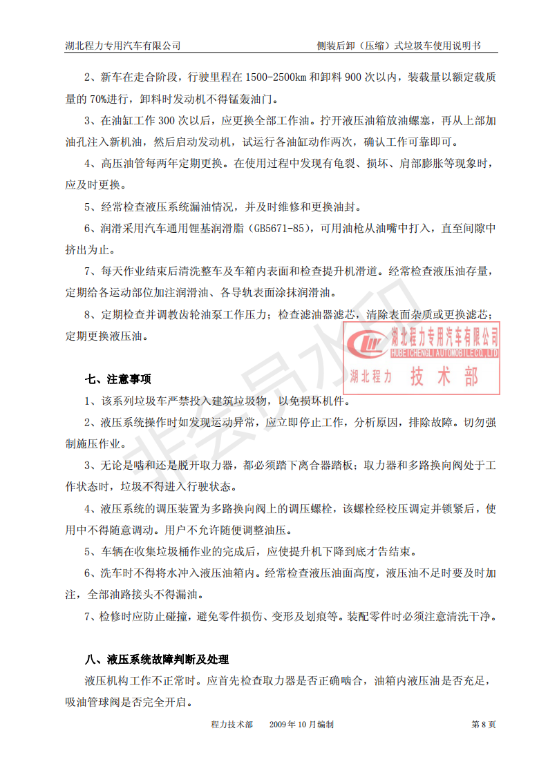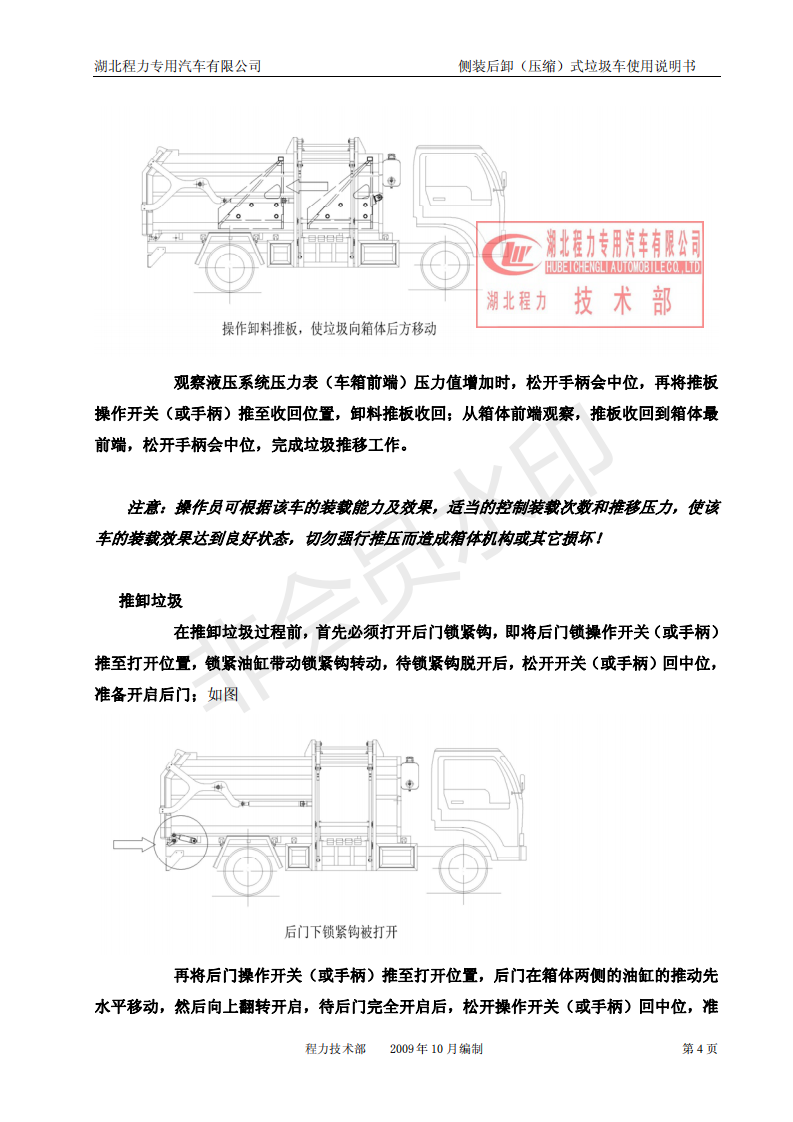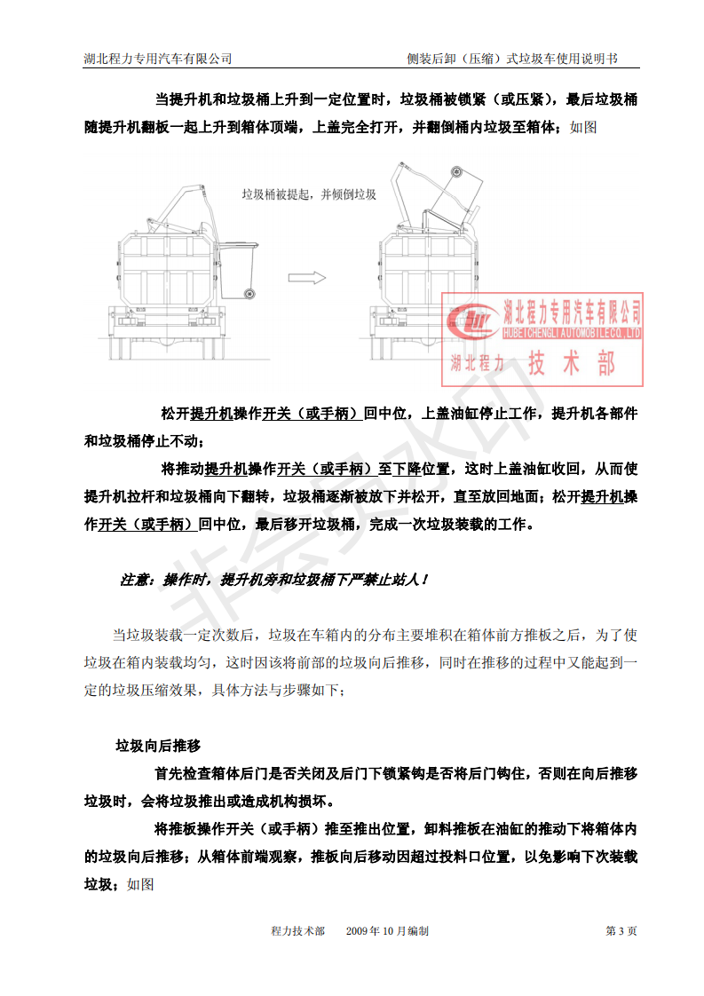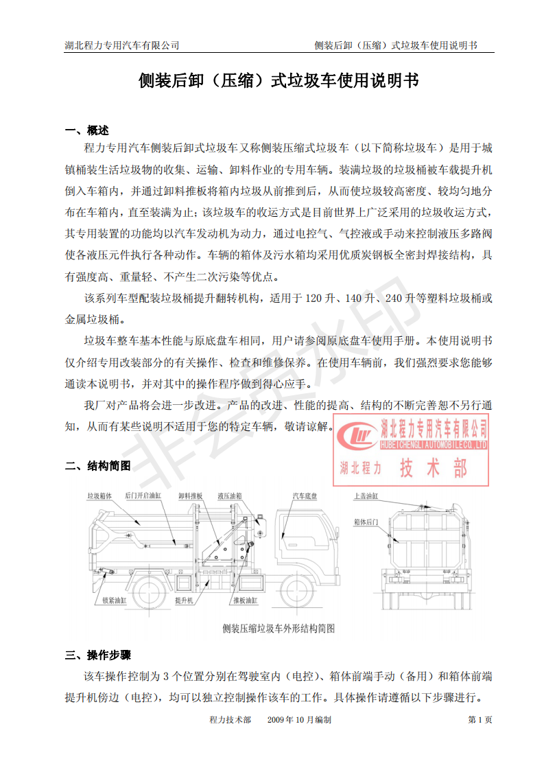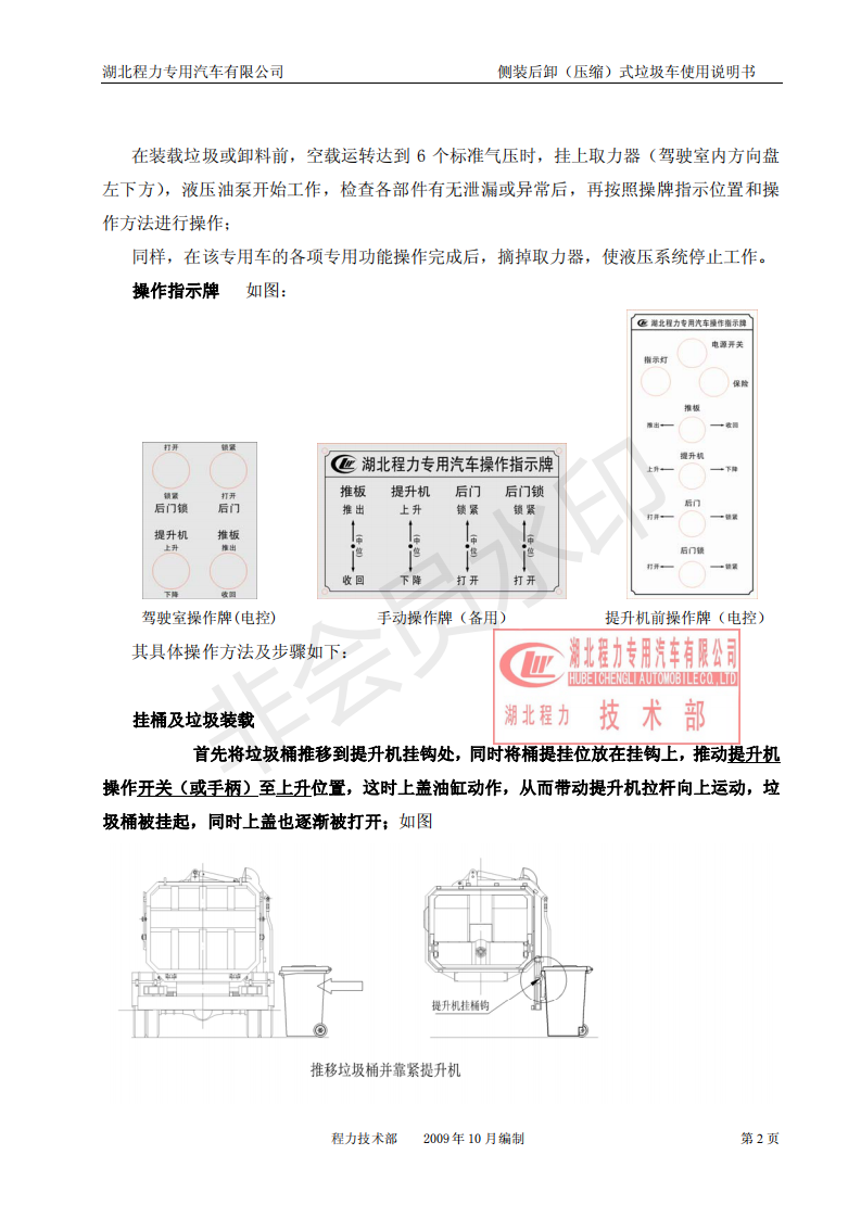 湖北程力側(cè)裝后卸(壓縮)式掛桶垃圾車(chē)使用說(shuō)明書(shū)