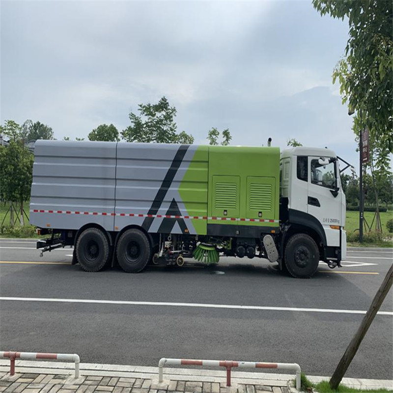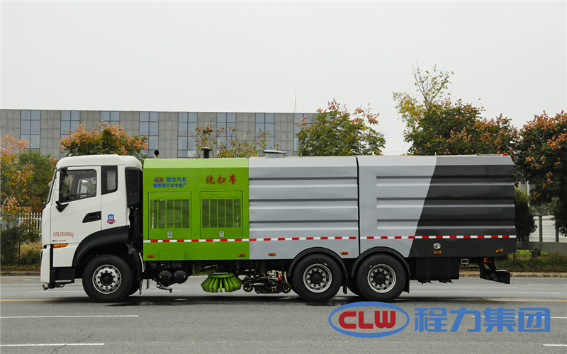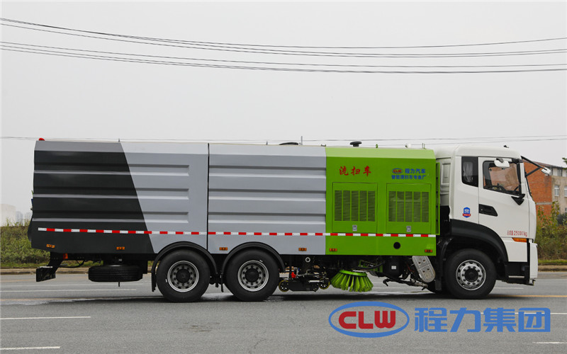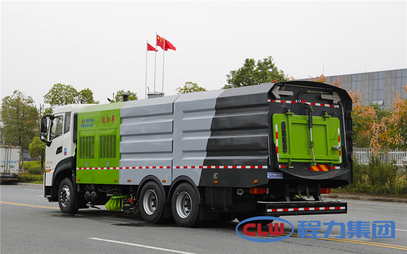 東風天龍洗掃車副發動機驅動風機和高壓水泵,副發動機采用東風康明期6缸柴油發動機。 風機用8.0高壓離心風機,效率高、風量大,最高風量達23500m3/h。 東風天龍洗掃車高壓水泵采用同際知名T7012IR 型柱塞柱,流量合適,壓力高,允許最高壓力達10MPa,清水箱充分利用了車載空間,容積大,容積達12m3。 東風天龍洗掃車垃圾箱采用單層不銹鋼結構,傾翻卸料,帶高壓位自潔裝置。自潔裝置可在垃圾箱卸料時幫助卸料,清洗垃圾箱內部。 東風天龍洗掃車左右立掃為單掃盤,減少了掃刷數量和掃刷消耗量,能降低使用成本。左右立掃分開控制,可實現左掃、右掃和全掃等不同作業模式。寬吸嘴的吸口寬度達到2418mm,確保作業總寬度大于3.5mm。 湖北程力國六東風天龍后雙橋大型洗掃4個高度可調的吸嘴輪,能方面調整和保證吸嘴與路面間的合理間隙。吸嘴內高有噴水桿,盡可能多地將高壓洗滌噴嘴布置在吸嘴內部,不但清洗效果好,還能最大限度減少高壓水氣流沖起污物產生的二次污染。左右噴水桿安裝在吸嘴上,隨吸嘴升降,結構簡單緊湊,保證噴水桿的離地高度固定不變,達到最佳清洗效果。 東風天龍洗掃車開式液壓系統驅動左右立掃升降、左右掃肋旋轉、吸嘴升降、垃圾箱后門開閉、垃圾箱傾翻復位等機械動作。底盤變速箱側取力器驅動低壓水泵,實現灑水車的低壓沖洗功能。一鍵式作業起動和停機操作。 東風天龍大型洗掃車具有路面清洗、路面清掃、路緣清洗、路緣和路緣石立面洗刷、低壓沖洗、噴霧除塵等多功能。有“全洗掃”、 “左洗掃”、 “右洗掃”、 “全掃”、 “左掃”、 “右掃”6種作業模式可選擇。選擇“全洗掃”模式清洗廣場和路面,清洗效率高效果好,洗凈率達90%以上。選擇“左洗掃”或“右洗掃”模式清洗路面和路緣、洗刷路緣石立面。需要進行路面清掃或路面保潔作業時,可選擇掃路模式。需要噴霧除塵時,可開啟噴霧裝置,進行噴霧除塵作業。可以像灑水車一樣對路面進行低壓沖洗作業。 東風天龍大型洗掃車適用于城市道路、高速公路、廣場、機場、碼頭、遂道、橋梁、隔離墻避、路緣和路緣石立面的機械化清洗、清掃、噴霧降塵等清潔作業。
