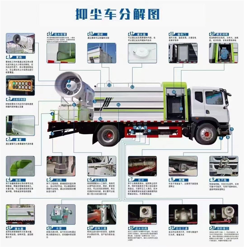 1、整車裝備、結(jié)構(gòu)緊湊、布局合理、部件做工精細、產(chǎn)品配置完善、操作性能好。 2、霧炮射程遠、覆蓋面積大、霧粒細小、與飄起的塵埃接觸時,形成一種潮濕霧狀體,能快速將塵埃抑制降沉。 3、適用范圍廣、工作效率高、可邊行駛邊噴霧、噴霧速度快、對塵埃有較強的穿透力和霧珠附著力、能有效地節(jié)約用水量和減少環(huán)境污染。 4、遙控/手動兼容、起動快捷、使用安全、靈活方便、性價比高。 5、微電機控制水平旋轉(zhuǎn),液壓馬達控制俯仰角度,交換角度速度快。 | 湖北程力國六多利卡8方抑塵車(方罐)程力威牌CLW5120TDYE6型多功能抑塵車圖片價格: